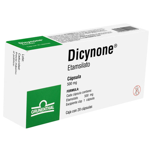 GrunenthalCategoría Medicamentos Línea Etamsilato Marca Dicynone Molécula Etamsilato Presentación 500 mg con 20 cápsulas Laboratorio Grunenthal Indica...
