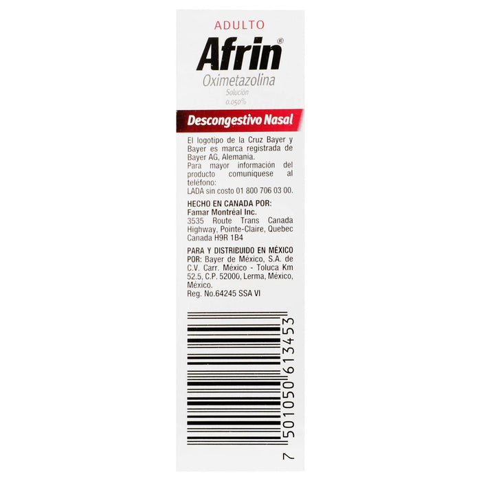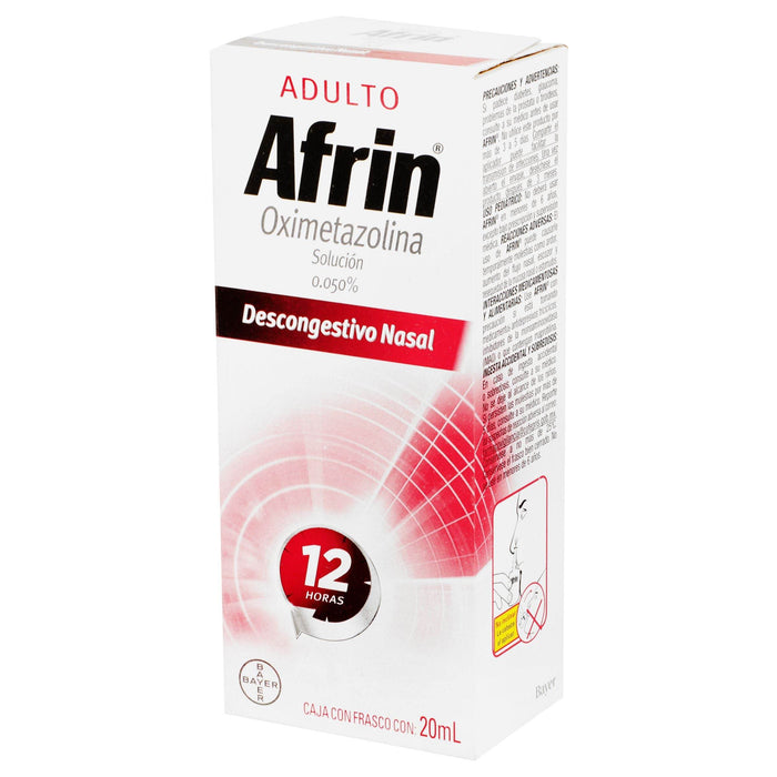 Afrin Adulto Spray 0.050% está indicado para el alivio temporal de la congestión nasal asociada con resfriados, alergias, y sinusitis. Su acción descongestionante se debe a la vasoconstricción de los vasos sanguíneos en la mucosa nasal, lo que reduce la hinchazón y la congestión. Este medicamento proporciona un alivio rápido y efectivo, permitiendo una mejor respiración nasal.
