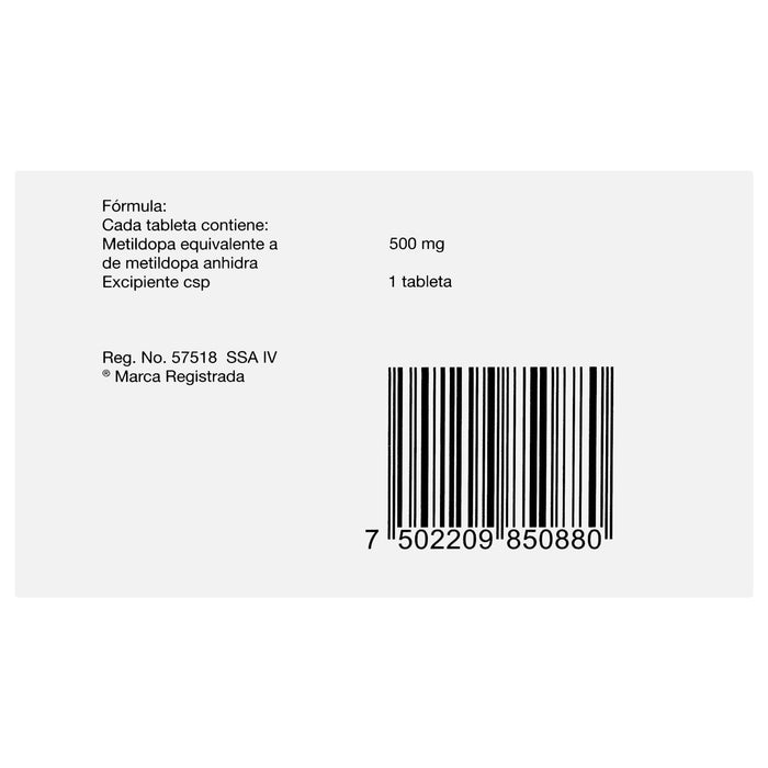 Cada tableta de Aldomet contiene 500 mg de Metildopa como principio activo, así como excipientes necesarios para la formulación del medicamento.
