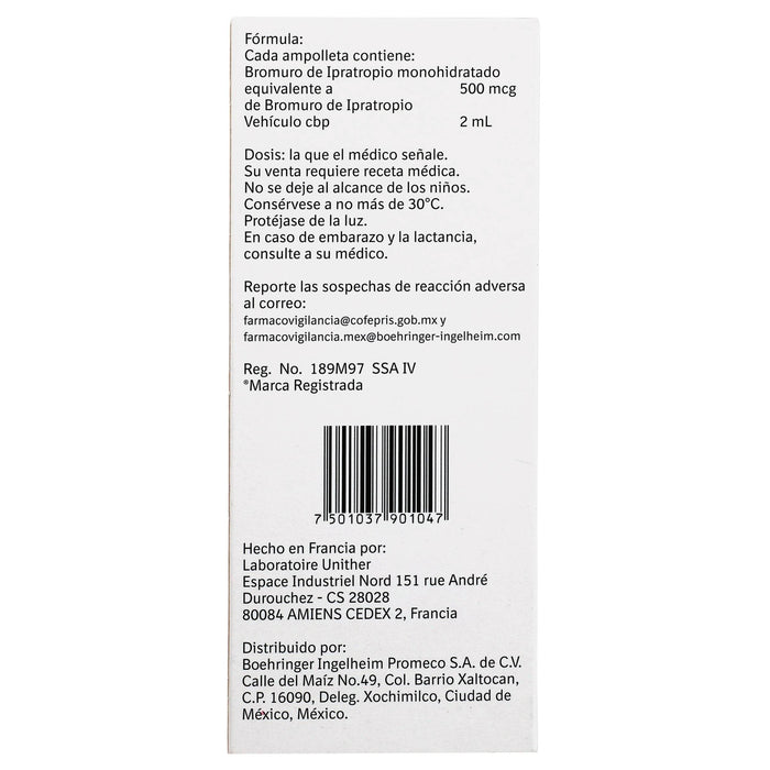 Atrovent 500 Mcg/2 ml, disponible en 10 ampulas.