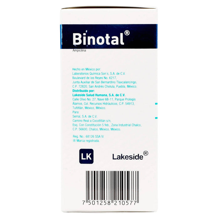Binotal Suspensión está indicado en el tratamiento de infecciones bacterianas causadas por microorganismos susceptibles a la ampicilina. Estas infecciones pueden incluir, pero no se limitan a, infecciones del tracto respiratorio, otitis media, infecciones del tracto urinario, y ciertas infecciones gastrointestinales. La ampicilina es eficaz contra una variedad de bacterias grampositivas y gramnegativas, lo que la convierte en una opción terapéutica adecuada en el manejo de infecciones agudas y crónicas.