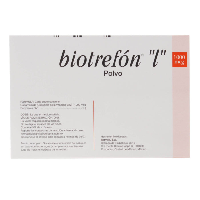 Cada sobre de Biotrefon L contiene 1000 mcg de cobamamida como principio activo. Además, incluye excipientes necesarios para la formulación del polvo.