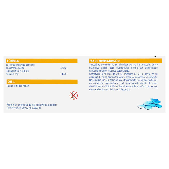 Cada jeringa de Bolentax contiene 40 mg de Enoxaparina Sódica, así como excipientes necesarios para su formulación. Es importante seguir las indicaciones del médico para asegurar una administración adecuada y segura del medicamento.