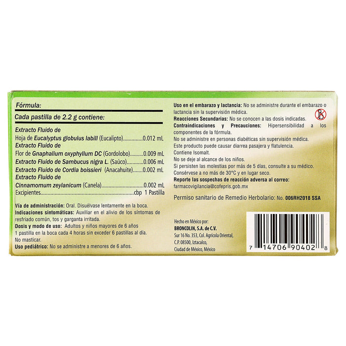 Cada pastilla de Broncolin Sugar Free contiene una combinación de extractos de plantas que contribuyen a sus propiedades benéficas para la salud respiratoria. La fórmula está diseñada para ser efectiva y segura, cumpliendo con los estándares de calidad del laboratorio Broncolin.