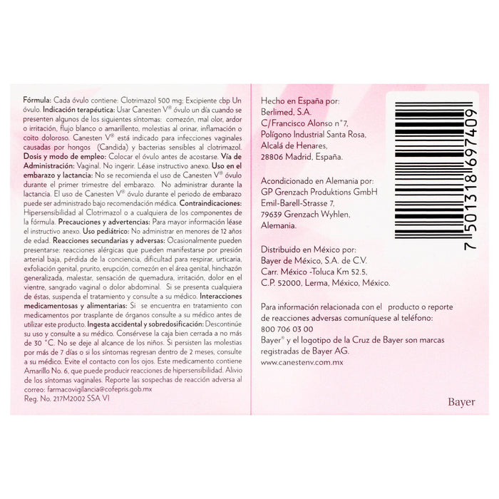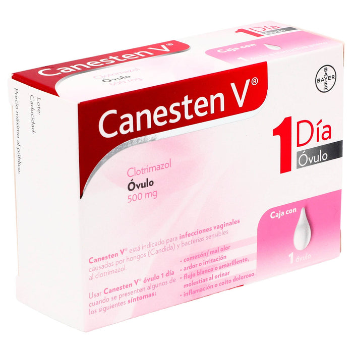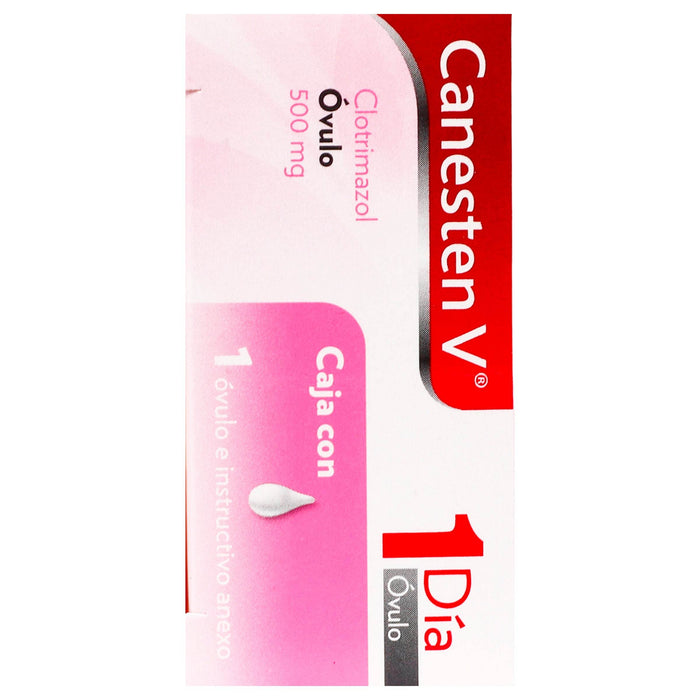 Canesten V Óvulo 500 mg está contraindicado en pacientes con hipersensibilidad conocida al clotrimazol o a cualquiera de los componentes de la formulación. No se recomienda su uso durante la menstruación ni en caso de infecciones vaginales de origen no fúngico.