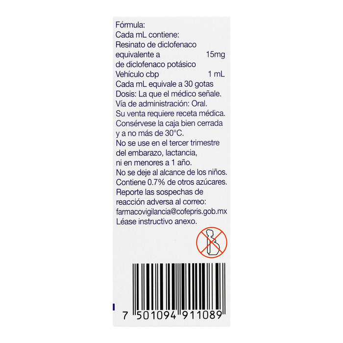 Cada ml de suspensión contiene 15 mg de diclofenaco (en forma de diclofenaco potásico) como principio activo. Excipientes: agua purificada, glicerol, saborizante, y otros excipientes necesarios para la formulación de la suspensión.