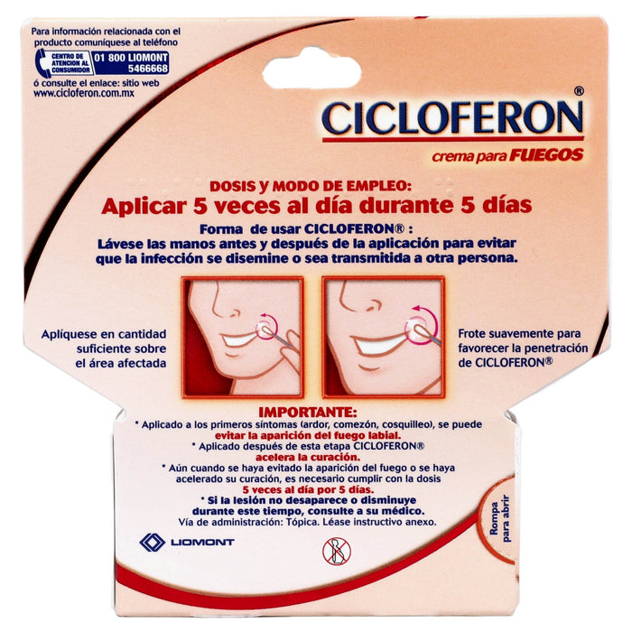Se debe tener precaución al utilizar Cicloferon Crema en pacientes con condiciones que afecten la función inmunológica. Evitar el contacto con los ojos y mucosas. Si se presentan reacciones adversas, se debe interrumpir el tratamiento y consultar a un médico. Es importante no aplicar la crema sobre heridas abiertas o piel irritada.