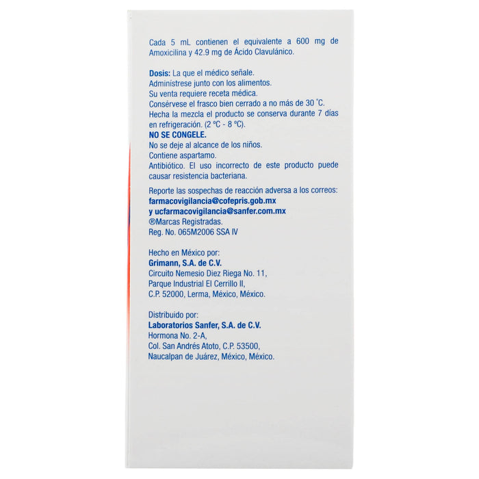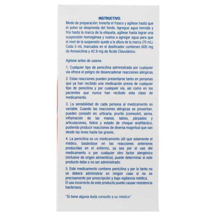 Cada 5 mL de suspensión contiene: Amoxicilina 600 mg y Ácido Clavulánico 42.9 mg. Excipientes: sacarosa, goma xantana, sabor a fresa, entre otros.