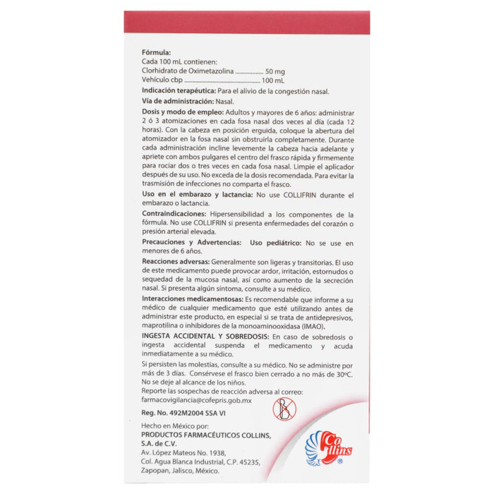 Collifrin Spray está contraindicado en pacientes con hipersensibilidad conocida a la oximetazolina o a cualquiera de los componentes de la fórmula. No se recomienda su uso en pacientes con condiciones cardiovasculares graves, hipertensión no controlada o enfermedad tiroidea no tratada. Asimismo, su uso en niños menores de seis años debe ser supervisado por un médico.