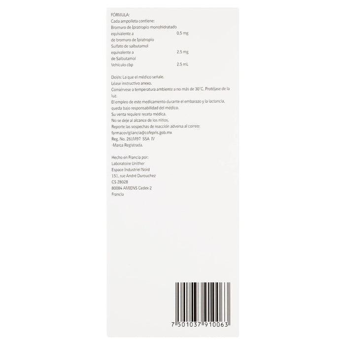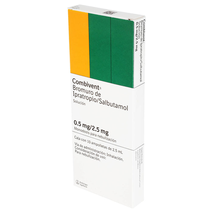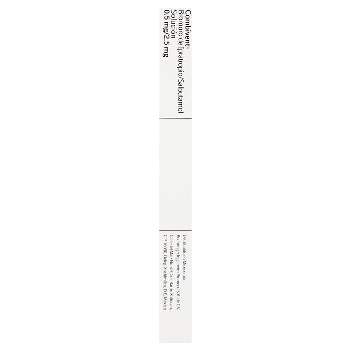Cada ampula de Combivent contiene 0.5 mg de Ipratropio y 2.5 mg de Salbutamol, además de excipientes que favorecen su eficacia y estabilidad.