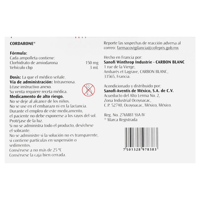 Cada ampula de Cordarone contiene: 150 mg de amiodarona, además de excipientes como agua para inyección y otros componentes necesarios para la formulación del medicamento.