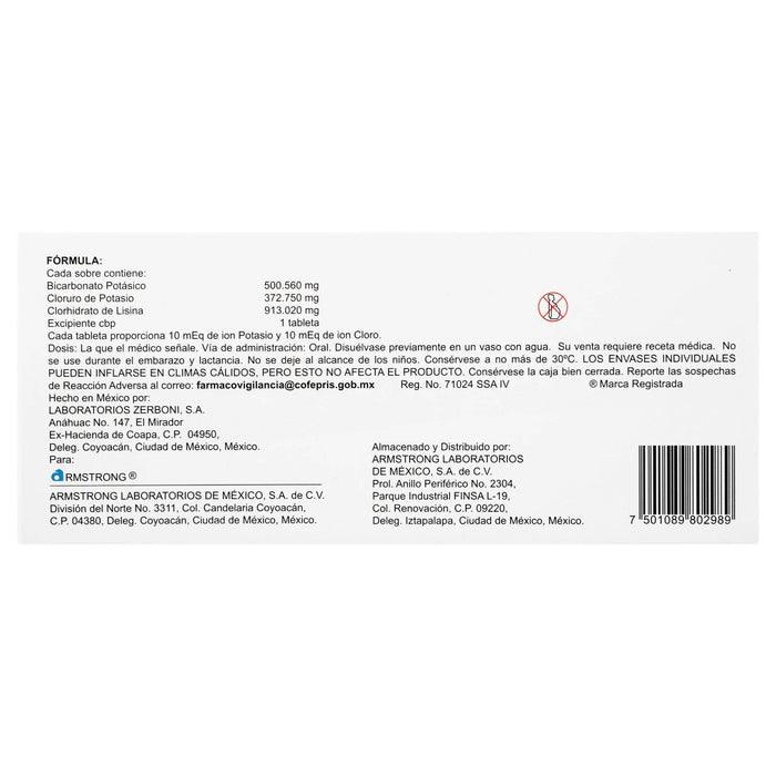 Cada tableta efervescente contiene: Bicarbonato de Potasio 500 mg, Cloruro de Potasio 300 mg, Lisina 100 mg.