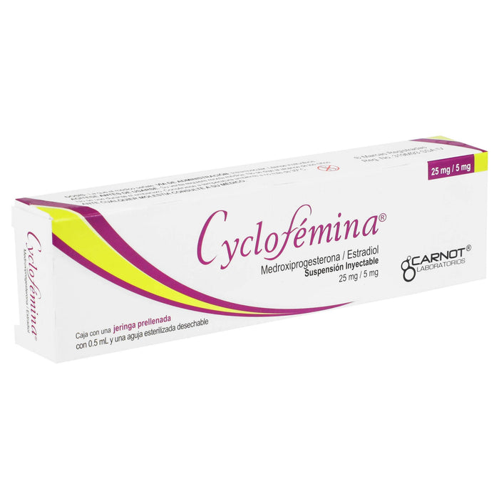 Cada jeringa de Cyclofemina contiene: 25 mg de Medroxiprogesterona y 5 mg de Estradiol, en una presentación de 0.5 ml.