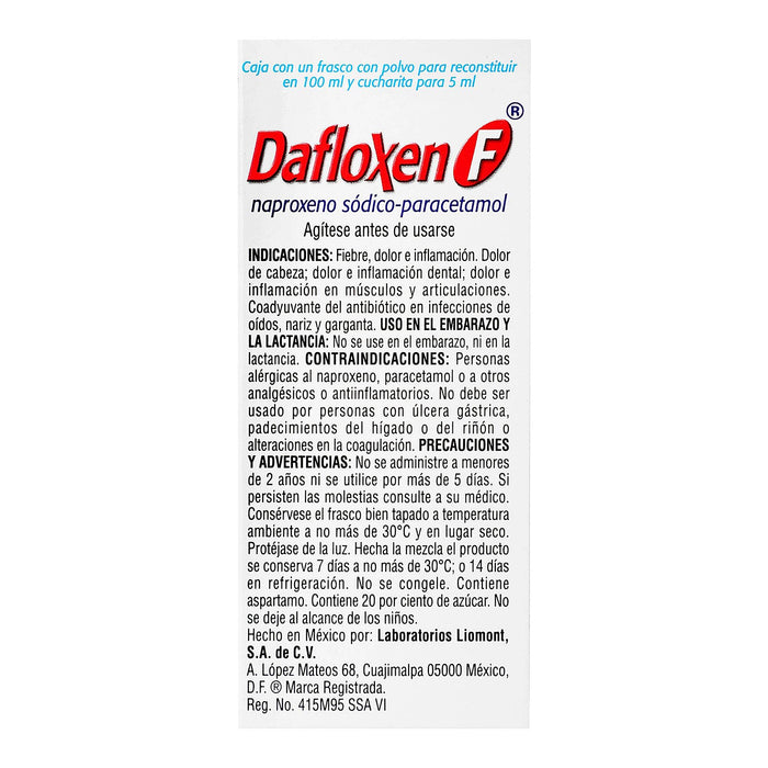 Cada 5 ml de Dafloxen F Suspensión contiene: 125 mg de Naproxeno y 100 mg de Paracetamol. Excipientes: Sorbitol, Glicerina, Ácido cítrico, Saborizantes, entre otros.