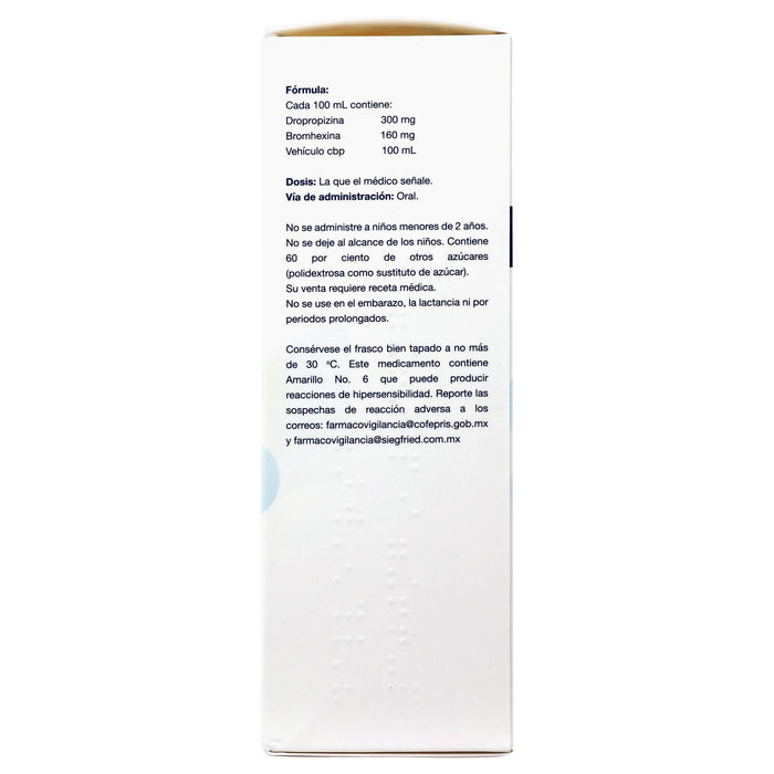 Cada 100 ml de jarabe contiene: Dropropizina 160 mg y Bromhexina 300 mg. Excipientes: azúcares, saborizantes, conservadores y agua purificada.