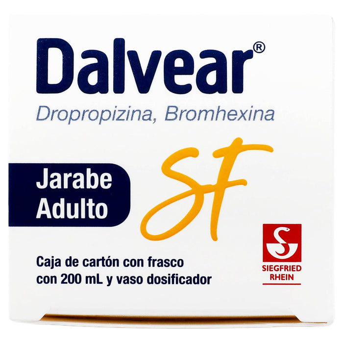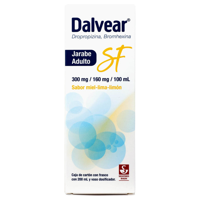 Dalvear SF es un medicamento indicado para el tratamiento de la tos seca y la tos productiva asociada a enfermedades respiratorias. La dropropizina actúa como un antitusígeno, ayudando a disminuir la frecuencia y la intensidad de la tos. Por otro lado, la bromhexina es un mucolítico que contribuye a la fluidificación del moco, facilitando su expulsión y mejorando la respiración en pacientes con condiciones como bronquitis, asma y otras afecciones pulmonares. Este medicamento es útil en el manejo de síntomas de infecciones respiratorias agudas y crónicas, proporcionando alivio en situaciones donde la tos y la producción de esputo son prominentes.