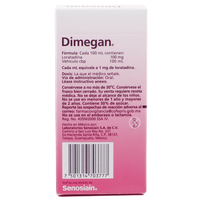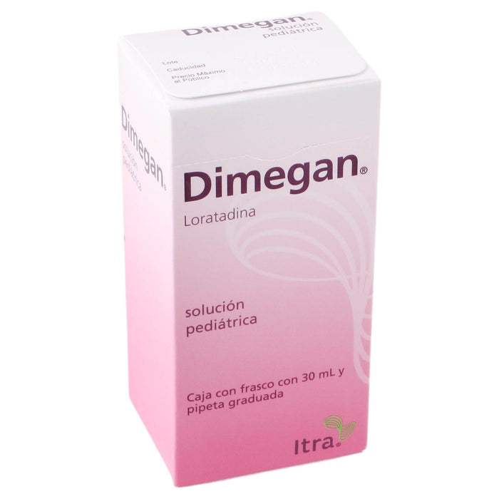Cada 100 ml de Dimegan Ped Solución contiene: Loratadina 100 mg. Excipientes: agua purificada, ácido clorhídrico, y otros excipientes.