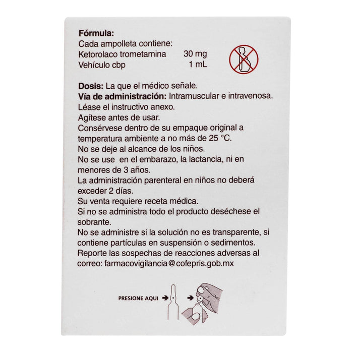 Cada ampula contiene: Ketorolaco trometamina 30 mg/ml. Excipientes: Cloruro de sodio, agua para inyección, ácido clorhídrico y/o hidróxido de sodio (pH ajustado a 6.0-7.0).