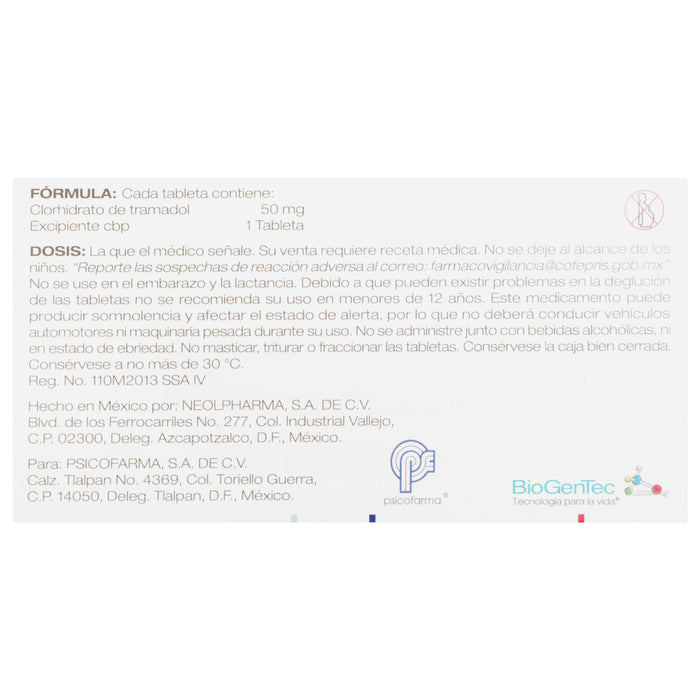 Cada tableta contiene 50 mg de Tramadol, además de excipientes necesarios para la formulación del producto.