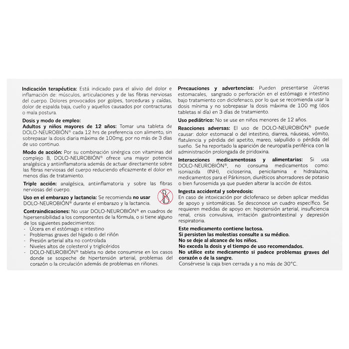 Dolo-Neurobion está contraindicado en pacientes con hipersensibilidad a alguno de los componentes de la fórmula, así como en aquellos con antecedentes de úlcera péptica activa, hemorragias gastrointestinales, insuficiencia renal severa y en el tercer trimestre del embarazo. No se recomienda su uso en pacientes con enfermedades cardiovasculares significativas sin supervisión médica.