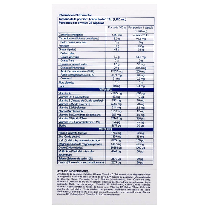 Cada cápsula contiene una mezcla de vitaminas como ácido fólico, hierro, yodo, así como ácidos grasos omega-3, entre otros micronutrientes que contribuyen a una adecuada nutrición durante el embarazo y la lactancia.