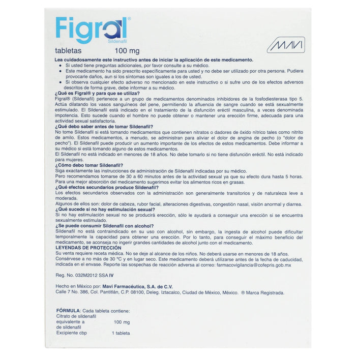 Cada tableta de Figral contiene 100 mg de Sildenafil como principio activo, además de excipientes necesarios para la formulación del producto.