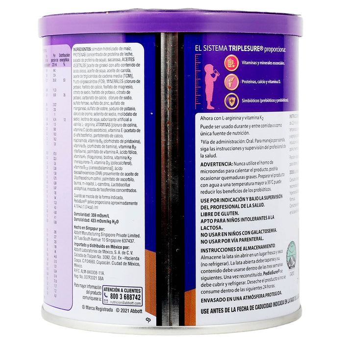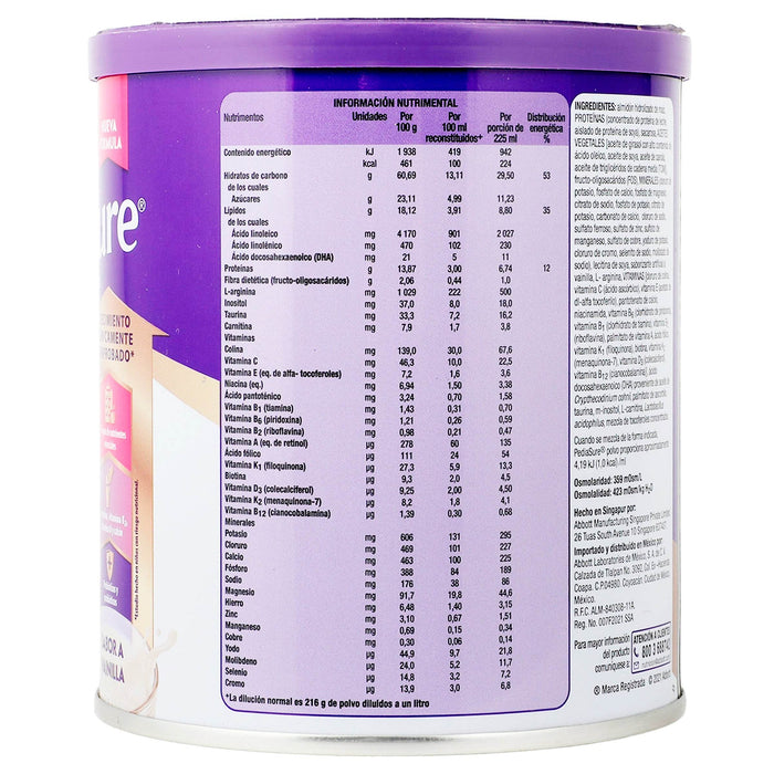 Pediasure es un suplemento alimenticio diseñado específicamente para niños que requieren una nutrición adicional. Está indicado para el apoyo del crecimiento y desarrollo en niños que presentan riesgo de desnutrición o que tienen problemas para consumir una dieta equilibrada. Es ideal para niños con necesidades nutricionales especiales, así como para aquellos que están en situaciones de enfermedad o recuperación. Este producto ayuda a complementar la ingesta diaria de nutrientes esenciales, contribuyendo a una adecuada ingesta calórica y proteica. Pediasure puede ser útil para niños con problemas de alimentación, como aversión a ciertos alimentos o aquellos que siguen dietas restringidas.