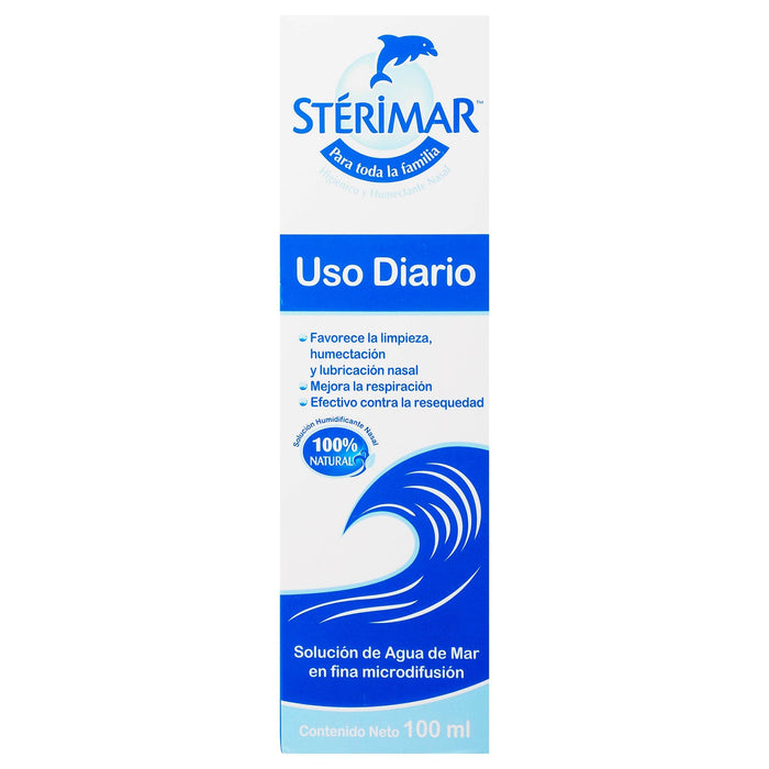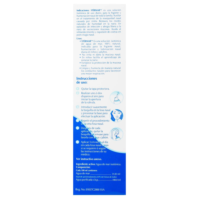 Sterimar Spray es un producto indicado para la higiene nasal diaria. Su formulación a base de agua de mar hipertónica ayuda a la limpieza de las fosas nasales, favoreciendo la eliminación de secreciones mucosas y partículas externas. Está recomendado para el tratamiento y prevención de la congestión nasal, así como para el alivio de los síntomas asociados a resfriados y alergias. También es útil en el cuidado de la mucosa nasal en ambientes secos o contaminados. Este producto puede ser utilizado por adultos y niños a partir de 2 años, facilitando la respiración y mejorando la calidad de vida de los usuarios.