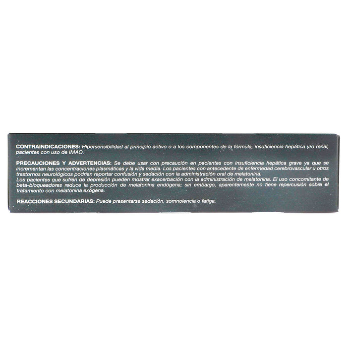 Este medicamento está contraindicado en pacientes que presenten hipersensibilidad a la melatonina o a cualquiera de los componentes de la fórmula. No se recomienda su uso en mujeres embarazadas o en periodo de lactancia sin la supervisión de un médico. Asimismo, no se debe administrar a niños menores de 12 años sin orientación médica adecuada.