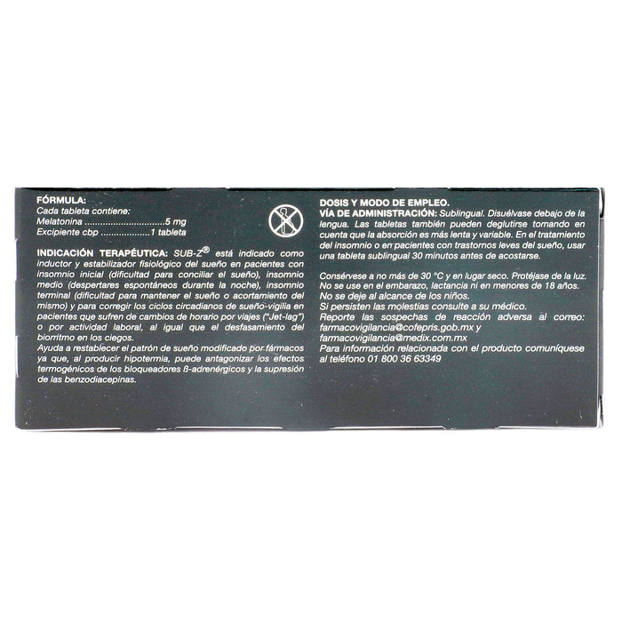Sub-Z Sl 5Mg se utiliza como un suplemento para ayudar a regular los ciclos de sueño, ayudando a las personas que padecen trastornos del sueño, como insomnio o alteraciones en el ritmo circadiano. La melatonina es una hormona que se produce de manera natural en el cuerpo y que juega un papel crucial en la regulación del ritmo sueño-vigilia. Este medicamento puede ser útil para personas que experimentan dificultad para conciliar el sueño o que sufren de jet lag debido a cambios en las zonas horarias. Se recomienda utilizar este producto en combinación con prácticas de higiene del sueño para potenciar sus efectos.