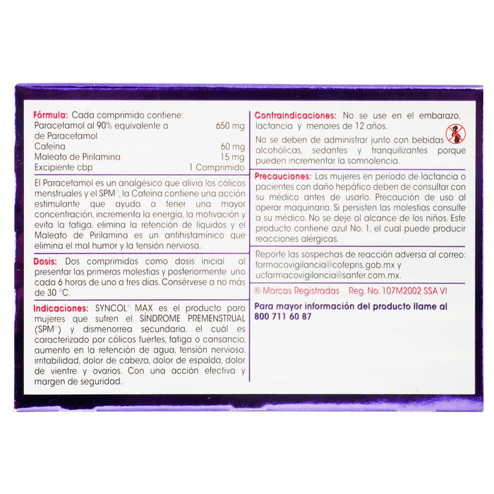 Syncol Max está indicado en el tratamiento del dolor leve a moderado, incluyendo dolores de cabeza, migrañas, dolores musculares, y síntomas de resfriado y gripe. La combinación de paracetamol, cafeína y pirilamina proporciona un efecto sinérgico que ayuda a aliviar el dolor y reducir la fiebre. El paracetamol es un analgésico y antipirético que alivia el dolor y la fiebre. La cafeína potencia el efecto analgésico del paracetamol y puede ayudar a mejorar la concentración y el estado de alerta. La pirilamina es un antihistamínico que ayuda a aliviar los síntomas asociados con la congestión nasal y la rinorrea.