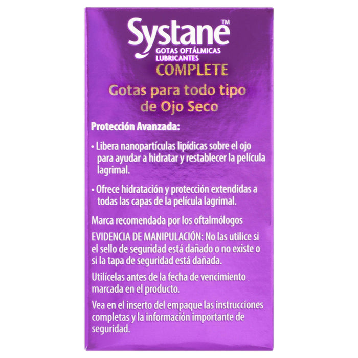 Systane Complete es una solución lubricante ocular indicada para el alivio temporal de la irritación y el malestar ocular causado por la sequedad. Está formulado para proporcionar una hidratación óptima a los ojos, lo que ayuda a restablecer y mantener la película lagrimal. Systane Complete puede ser utilizado por personas que usan lentes de contacto y es eficaz en la protección contra la irritación ocular provocada por factores ambientales como el viento, el humo y el aire seco. También es útil en la lubricación de ojos expuestos a condiciones que pueden causar sequedad, como el trabajo prolongado frente a pantallas, el uso de aire acondicionado o calefacción, y la exposición a ambientes polvorientos o contaminados.