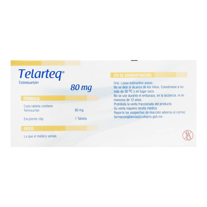 Cada tableta de Telarteq contiene 80 mg de Telmisartan como principio activo, así como excipientes que permiten la formulación del producto.