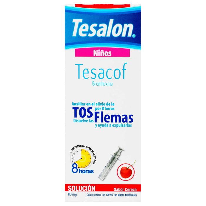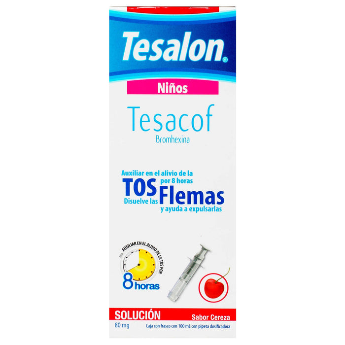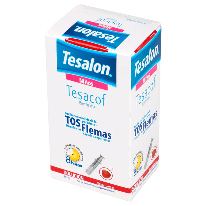 Cada 100 ml de Tesacof Niños solución contiene: Bromhexina hidrocloruro 80 mg. Excipientes: agua purificada, sorbitol, ácido cítrico, benzoato de sodio, entre otros.
