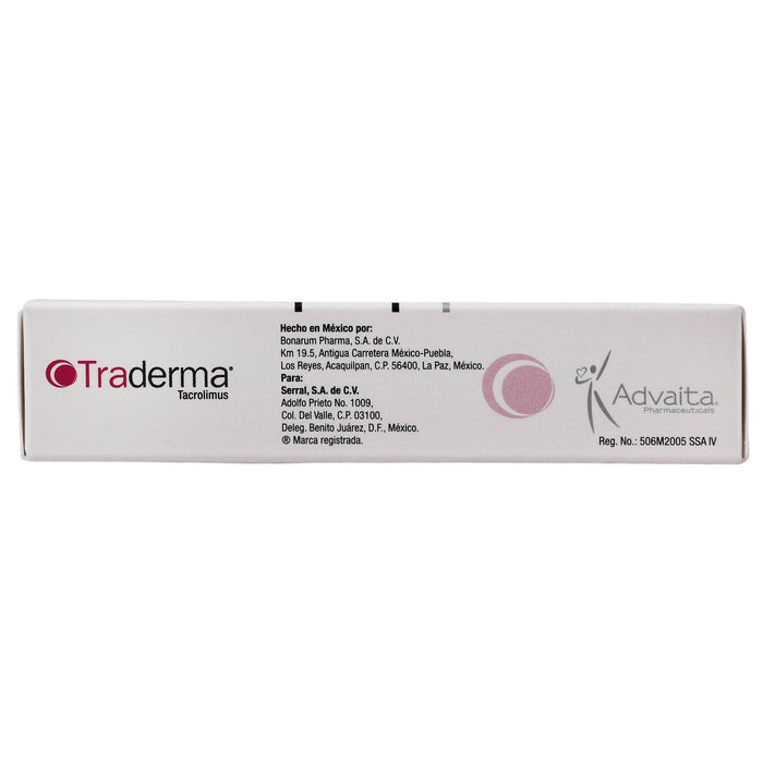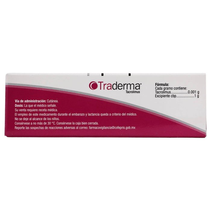 Cada 1 g de Traderma Ung 0.1% contiene 1 mg de tacrolimus como principio activo. Excipientes: parafina líquida, cera microcristalina, entre otros.