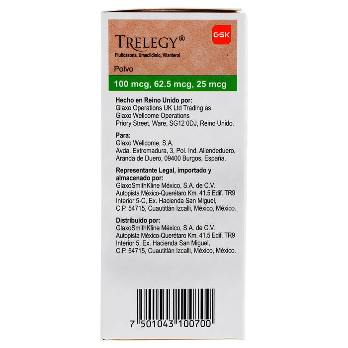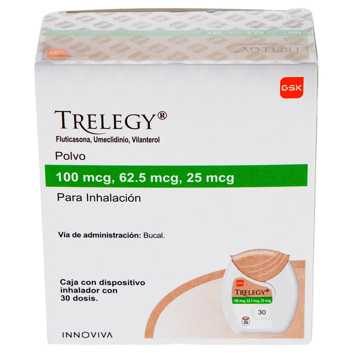 Trelegy está indicado en el tratamiento de pacientes adultos con enfermedad pulmonar obstructiva crónica (EPOC) que requieren un tratamiento de mantenimiento con broncodilatadores. Este medicamento también se utiliza en el manejo del asma en pacientes que no están adecuadamente controlados con un corticosteroide inhalado solo, o que requieren un corticosteroide inhalado y un broncodilatador de acción prolongada. Trelegy actúa mediante la combinación de tres componentes: Fluticasona, un corticosteroide que reduce la inflamación; Umeclidinio, un antagonista muscarínico que ayuda a dilatar las vías respiratorias; y Vilanterol, un agonista beta-2 de acción prolongada que también contribuye a la broncodilatación. El uso combinado de estos tres fármacos proporciona un control más eficaz de los síntomas respiratorios y mejora la calidad de vida de los pacientes.