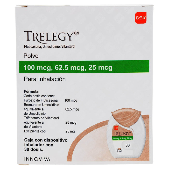 Cada dosis de Trelegy contiene: Fluticasona propionato 100 mcg, Umeclidinio 62.5 mcg, Vilanterol 25 mcg.