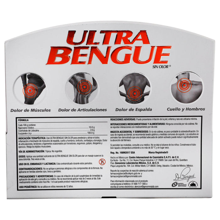 Ultra Bengue Gel está indicado para el alivio del dolor localizado y la inflamación en condiciones musculoesqueléticas, como esguinces, distensiones y lesiones deportivas. Este medicamento combina los efectos antiinflamatorios y analgésicos del naproxeno con la acción anestésica local de la lidocaína, proporcionando un efecto dual en el manejo del dolor. Se recomienda su uso en casos de artritis, tendinitis y dolores articulares, así como en situaciones donde se requiera un alivio rápido del dolor superficial.