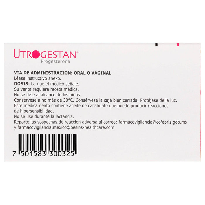 Utrogestan está contraindicado en pacientes con hipersensibilidad a la progesterona o a cualquiera de los componentes de la formulación. También está contraindicado en casos de sangrado vaginal no diagnosticado, trombosis venosa profunda, embolia pulmonar, antecedentes de cáncer de mama o de órganos dependientes de hormonas, y en casos de enfermedades hepáticas severas.