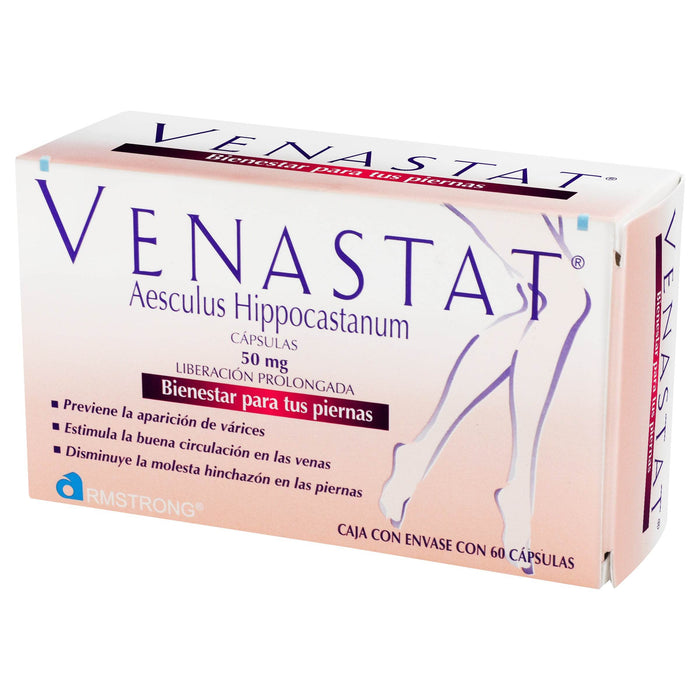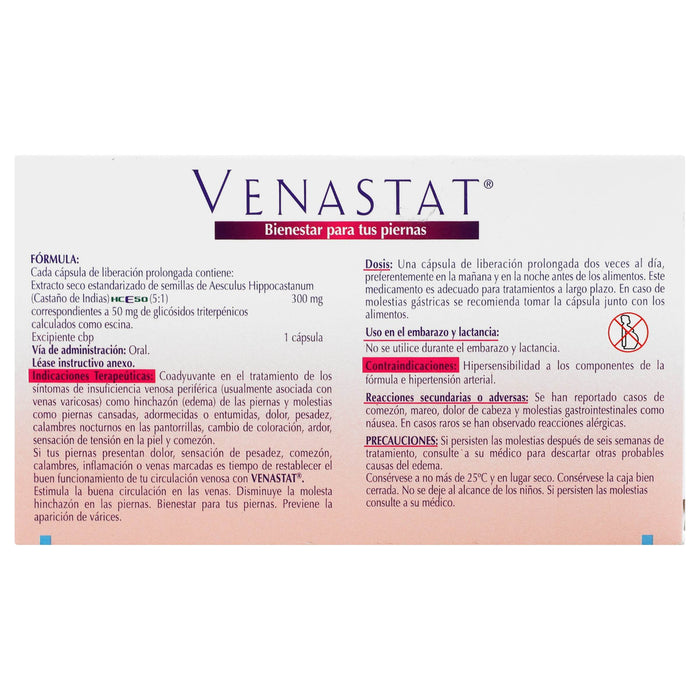 Cada cápsula de Venastat contiene 50 mg de Aesculus Hippocastanum, complementado con excipientes necesarios para la formulación del medicamento.