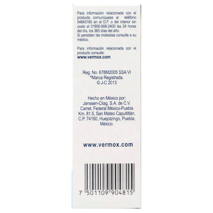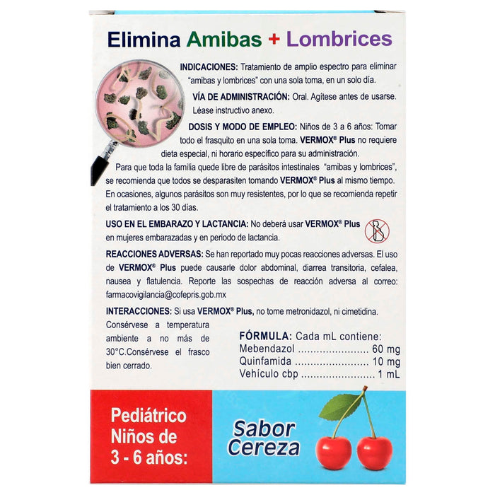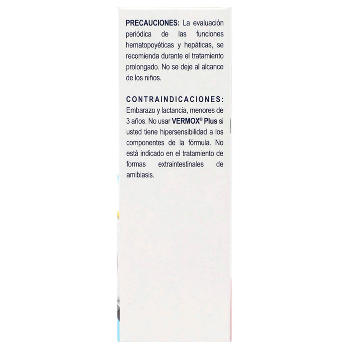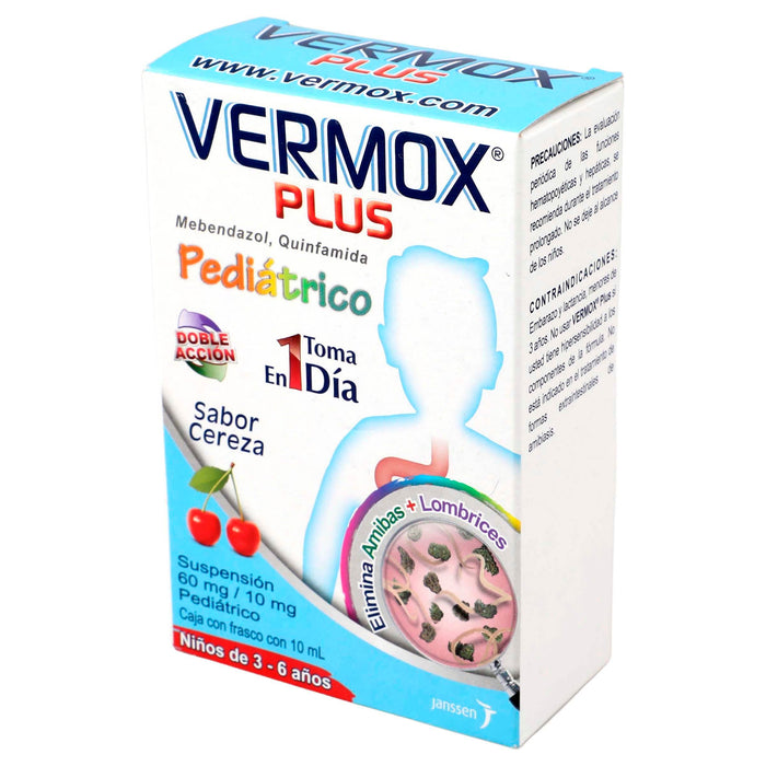 Vermox Plus Ped Suspensión está indicado para el tratamiento de infecciones intestinales causadas por helmintos sensibles a sus componentes, incluidos los siguientes: