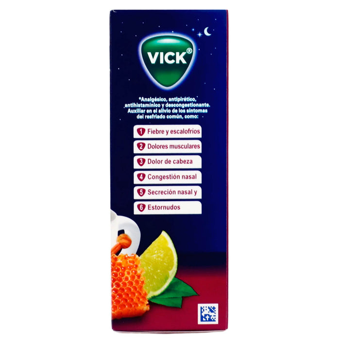 Vick Pyrena Noche es un medicamento indicado para el alivio temporal de los síntomas asociados a resfriados y alergias, que pueden incluir fiebre, congestión nasal, estornudos y tos. Su formulación combina tres componentes activos: el paracetamol, que actúa como analgésico y antipirético; la fenilefrina, un descongestionante que ayuda a reducir la inflamación y la congestión en las vías respiratorias; y la difenhidramina, un antihistamínico que proporciona alivio de los síntomas alérgicos y también ayuda a inducir el sueño, lo que lo hace especialmente útil para el uso nocturno.