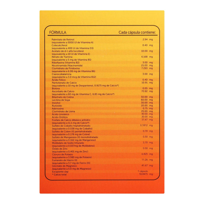 Cada cápsula contiene una combinación de vitaminas y minerales esenciales, incluyendo pero no limitándose a: Vitamina A, Vitamina C, Vitamina D, Vitamina E, Complejo B (B1, B2, B3, B6, B12), Ácido Fólico, Calcio, Magnesio, Zinc, entre otros. Para una lista completa de ingredientes y sus cantidades, consulte el empaque del producto.