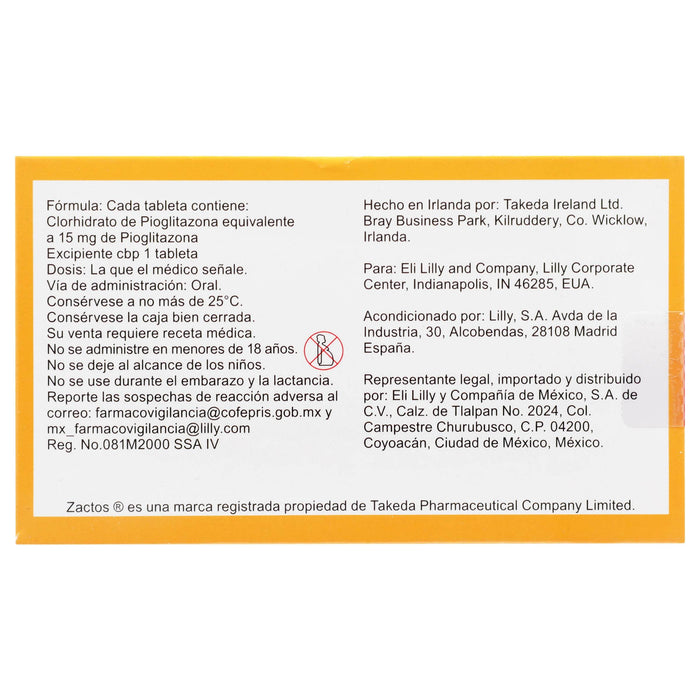 Cada tableta de Zactos contiene 15 mg de pioglitazona como principio activo. Además, contiene excipientes que favorecen la formulación y estabilidad del medicamento.