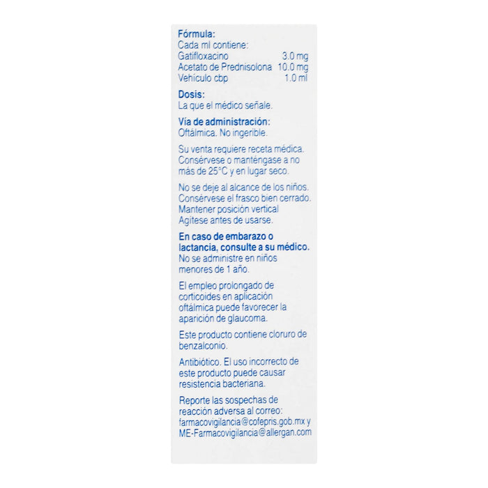 Este medicamento está contraindicado en pacientes con hipersensibilidad conocida a gatifloxacino, prednisolona, o a cualquier otro componente de la fórmula. También está contraindicado en infecciones virales y fúngicas no tratadas, así como en casos de tuberculosis ocular activa.